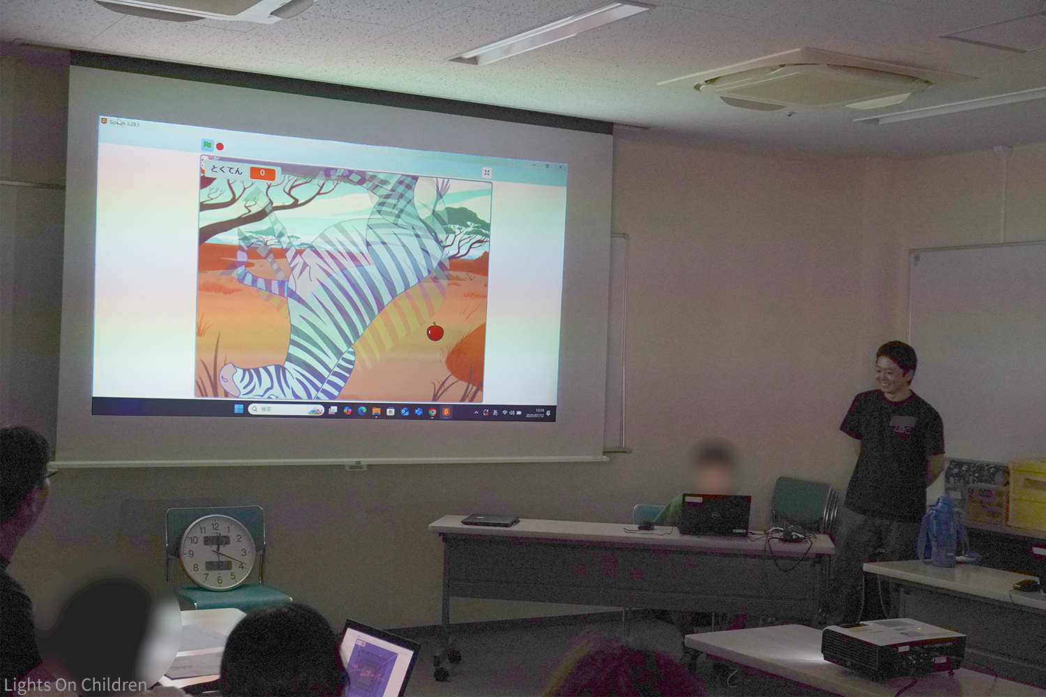先ほどとは別の小学5年生の男の子は、追いかけてくる鬼をシマウマに変えて、しかもプレーを進めるとサイズが徐々に大きくなっていくように工夫していました。作品発表では、シマウマが徐々に大きくなって画面を埋め尽くしていき、みんなから歓声が上がりました。